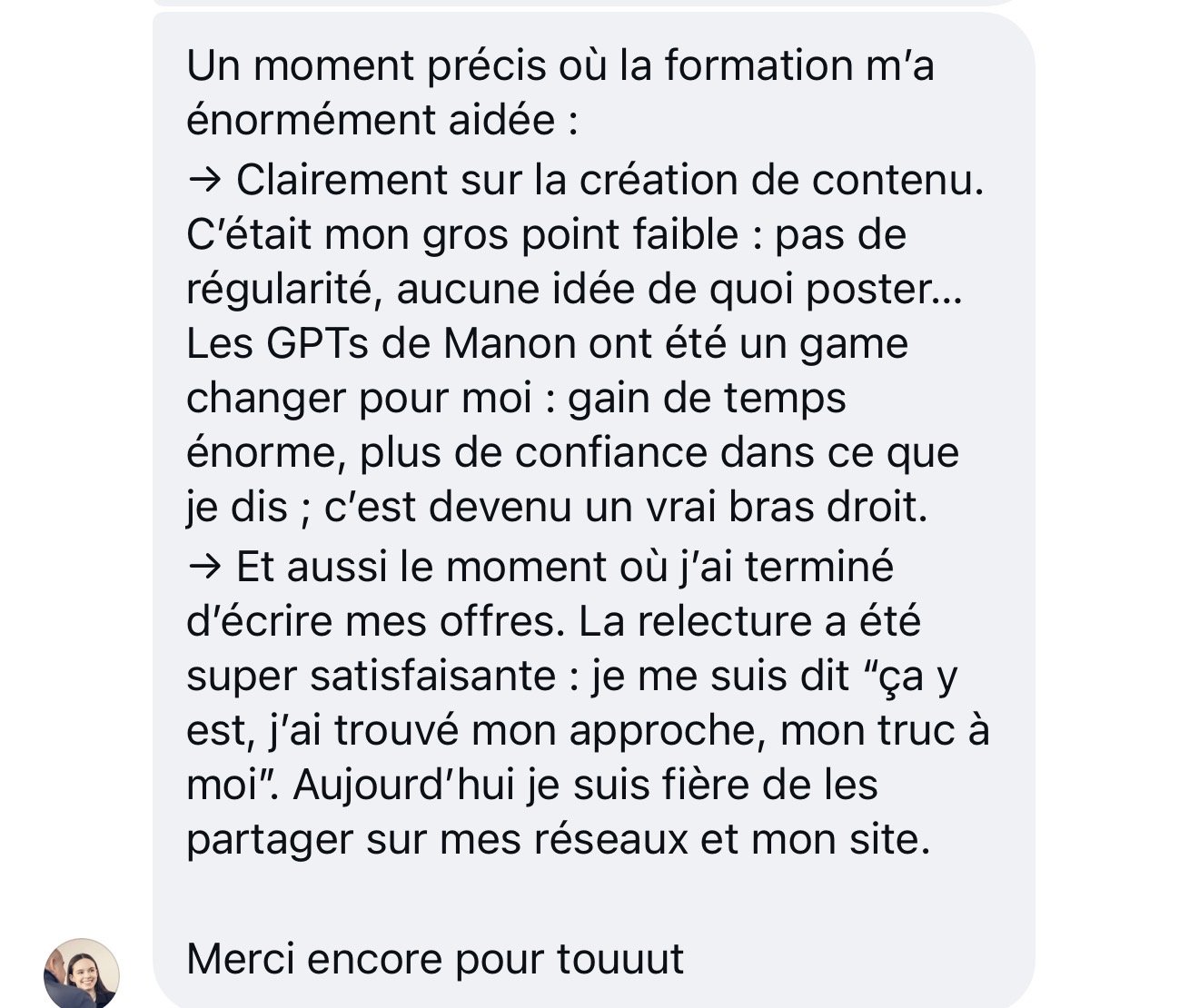 "Les GPTs de Manon ont été un game changer pour moi : gain de temps énorme, plus de confiance dans ce que je dis ; c'est devenu un vrai bras droit."
