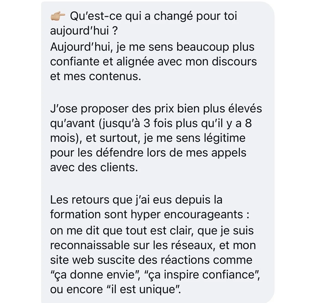 "Aujourd'hui, je me sens beaucoup plus confiante et alignée avec mon discours [...]. J'ose proposer des prix bien plus élevés (jusqu'à 3 fois plus), et surtout, je me sens légitime pour les défendre lors de mes appels."