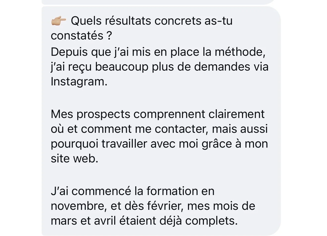 "Mes prospects comprennent clairement où et comment me contacter, mais aussi pourquoi travailler avec moi [...]. J'ai commencé la formation en novembre, et dès février, mes mois de mars et avril étaient déjà complets."