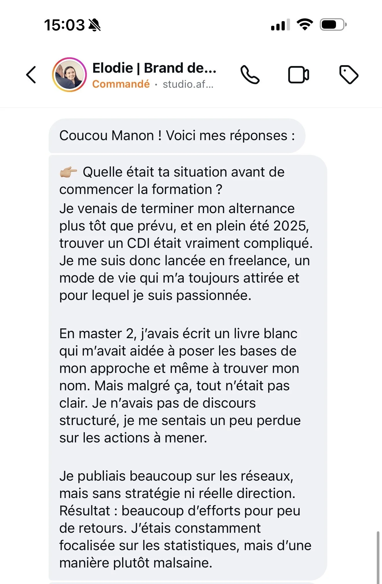 Élodie a d'abord fait exploser ses fausses croyances. Elle pensait devoir vendre un "branding express en 1 semaine" parce que d'autres le faisaient. Sauf que ses entretiens clients (méthode de la formation) lui ont prouvé tout l'inverse : sa cible ne cherchait pas la rapidité.